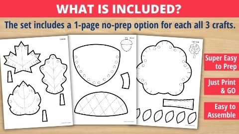 The fall theme set includes a fall tree craft, acorn craft, and fall leaves craft.