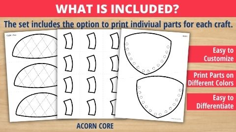 The easy-to-differentiate fall fine motor skills craft activities are perfect for your kids in your preschool, pre-k, kindergarten, 1st grade, SPED, and occupational therapy classroom. The set includes 2 printing options. A one-page no-prep option is super easy to prep…just print and go. You can also print the parts on individual pages.