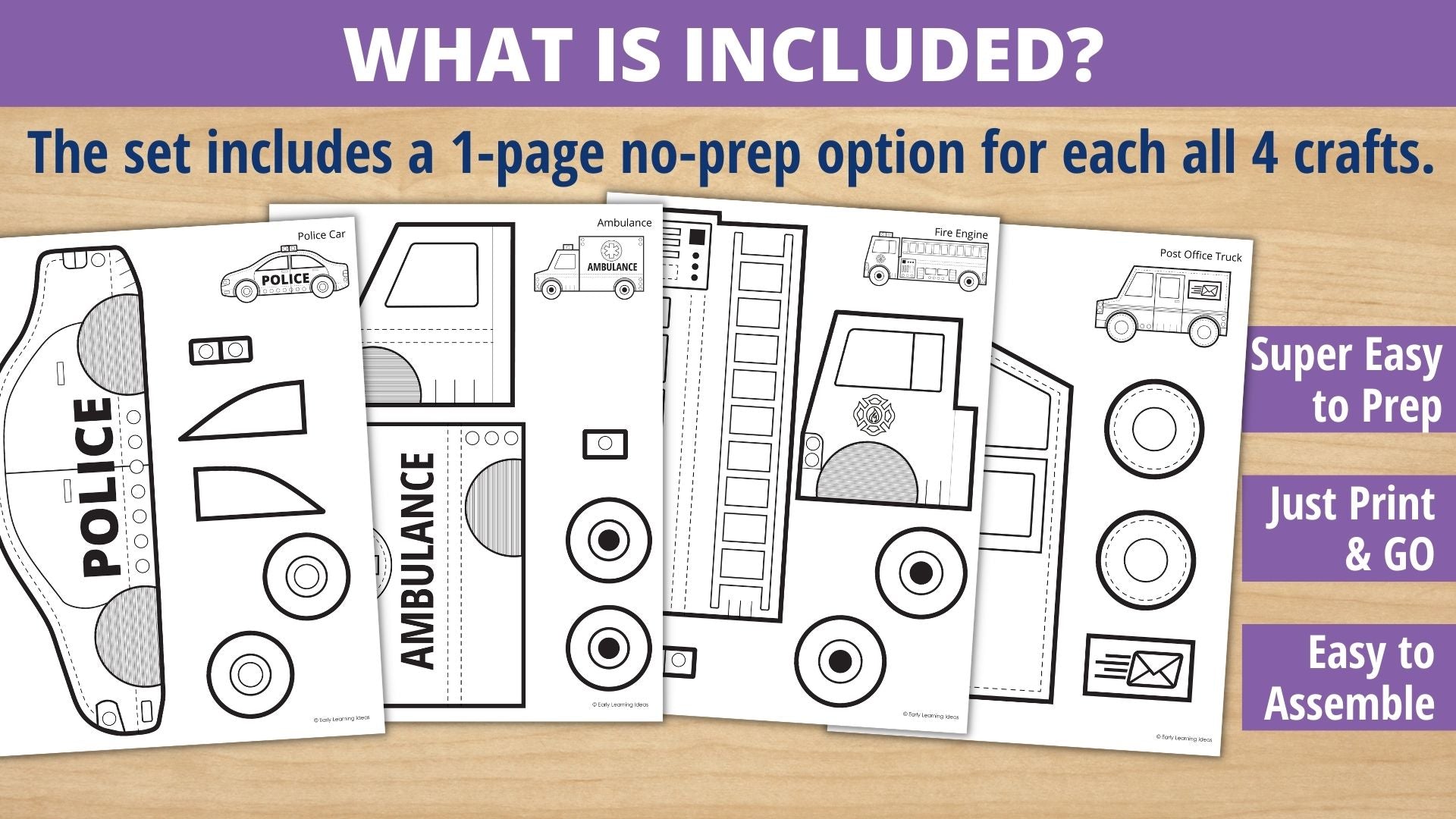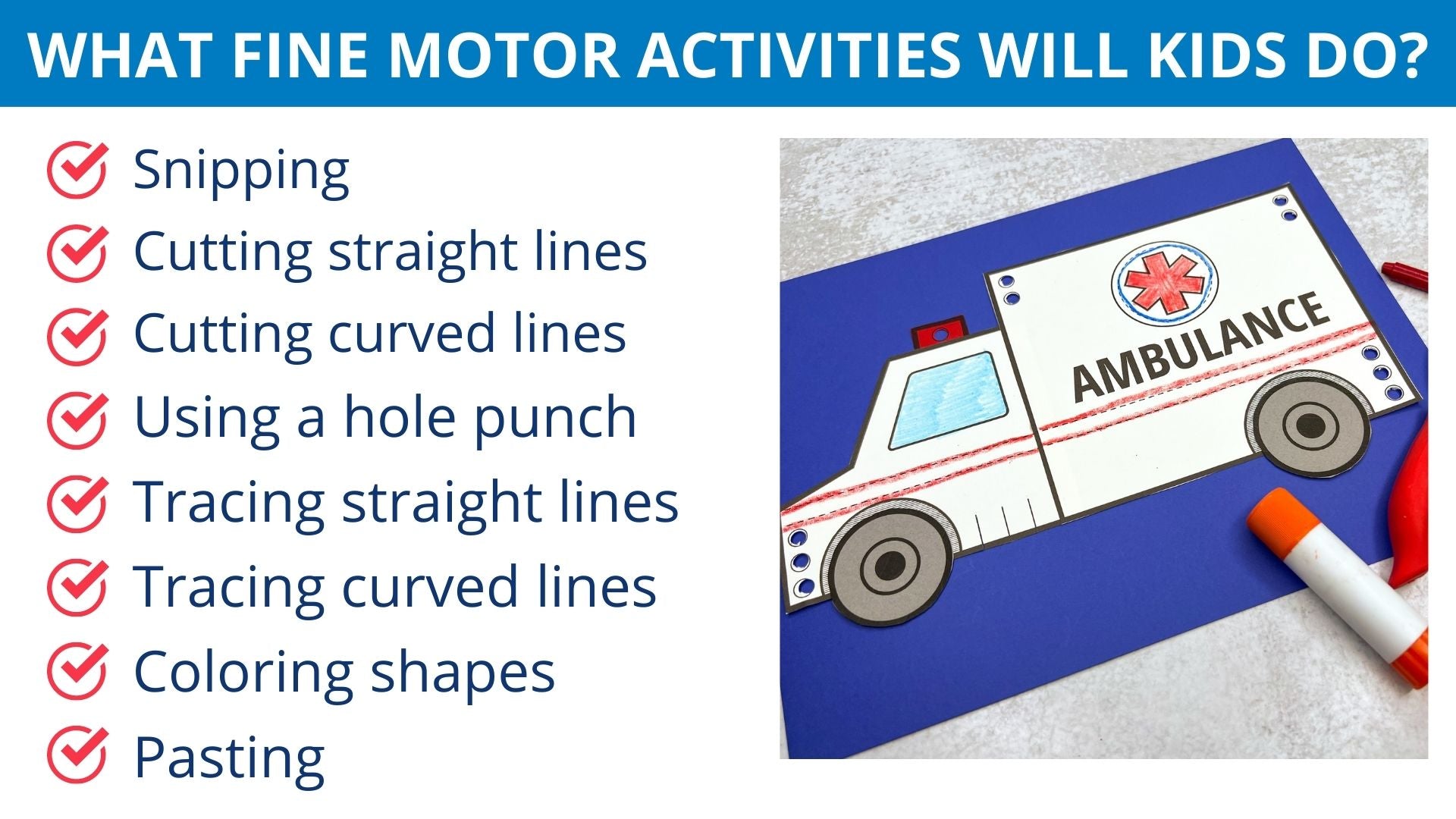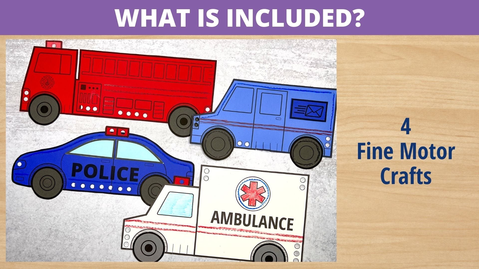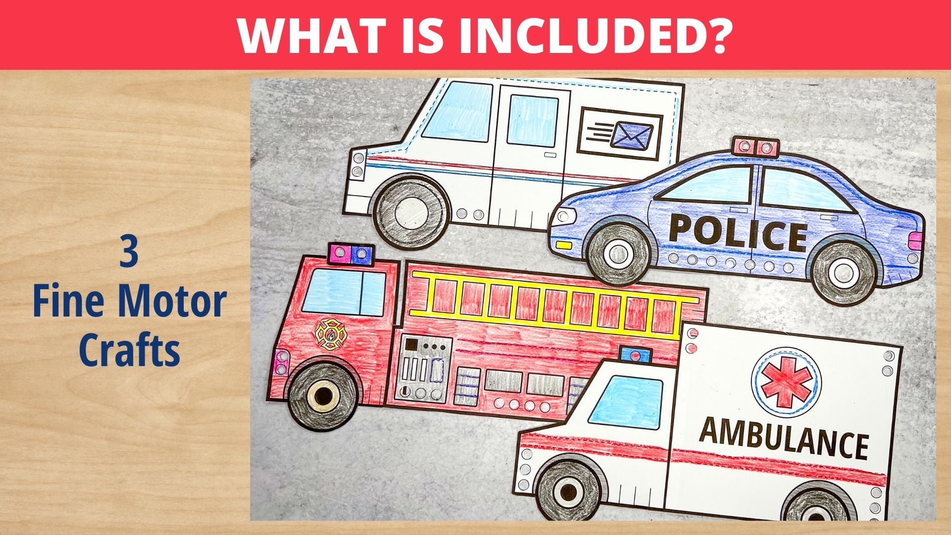 Looking for a fun way to boost your kids' fine motor skills? These engaging craft activities featuring community helpers and emergency vehicles are just what you need. Watch your little ones cut, trace, and hole punch their way to better fine motor skills. With crafts like police cars, fire trucks, ambulances, and post office trucks, they'll be having a blast while improving scissor skills, hand strength, and crayon control.