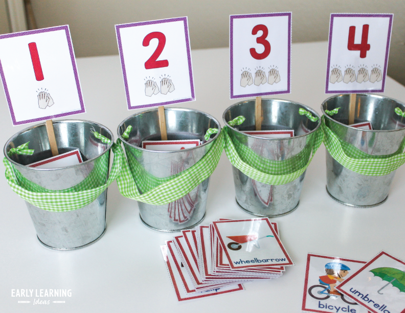 Sort into Containers: The 4 sorting labels can be attached to buckets, baskets, flower pots, boxes, etc. Children sort the picture cards into the appropriate container.