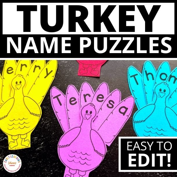 The editable Thanksgiving turkey name puzzles are easy to customize with the names of all the kids in your classroom. Teach name recognition or teach kids how to spell their names with this adorable printable. You can also create puzzles for sight words or 1-9 counting. This fun activity is perfect for your November, turkey, or Thanksgiving theme units, lesson plans, and literacy centers. You can also use the activity to supplement fun books such as Turkey in Disguise or a Turkey Trouble