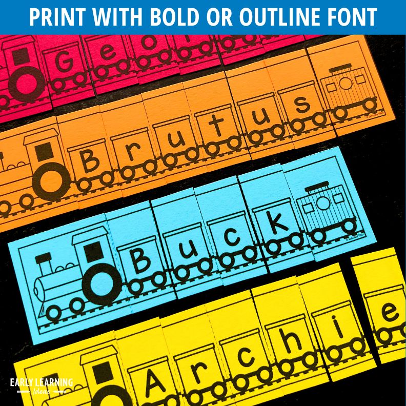 - 2 styles of name train puzzles - (black font & outline letter font for coloring or tracing)