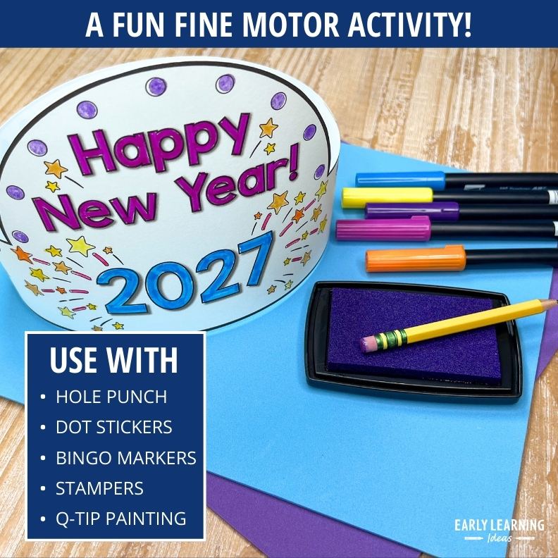 Looking for an easy, no-prep Happy New Year 2027 crown or headband craft that actually builds skills? This printable New Year’s hat activity is a fun, low-stress way for preschool and kindergarten kids to celebrate the New Year while strengthening fine motor skills, early writing confidence, and number recognition.