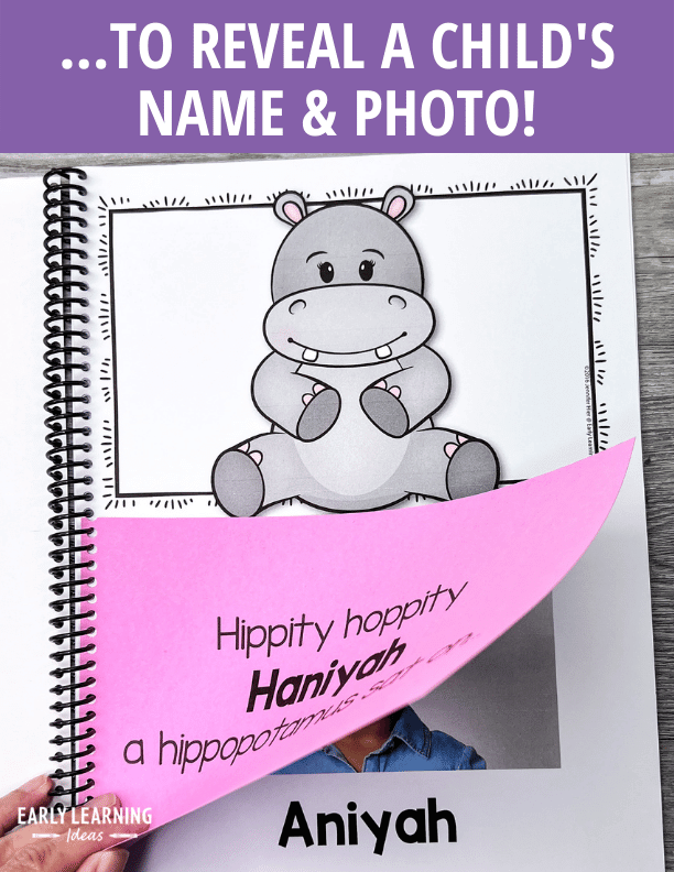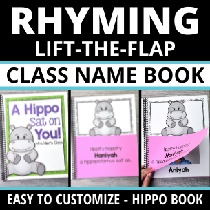 Use fun hippo interactive rhyming lift-the-flap name activity book to teach name recognition, beginning letters and sounds, and rhyming in a FUN and MEANINGFUL way. This editable emergent reader is perfect for preschool, pre-k, kindergarten, special education, RTI, early intervention, and home school classrooms.