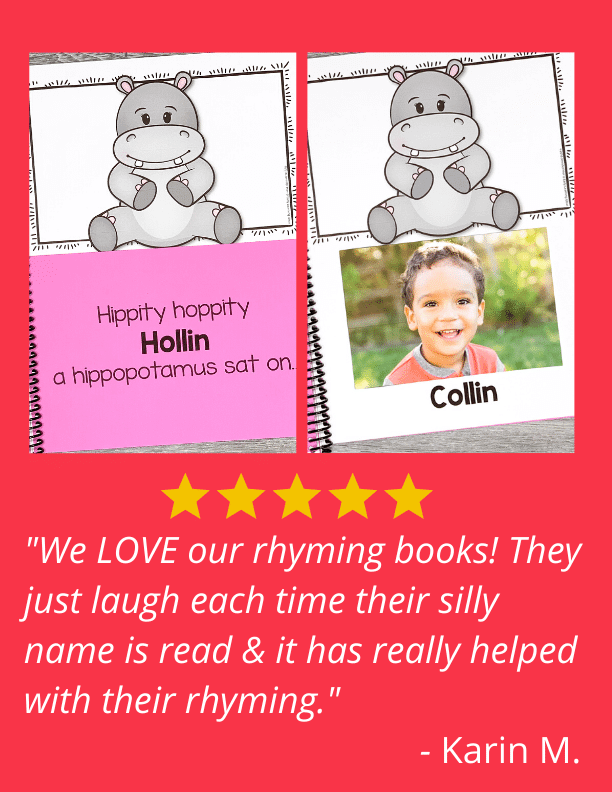 ⭐⭐⭐⭐⭐ "We LOVE our rhyming books! They just laugh each time their silly name is read & it has really helped with their rhyming. " - Karin M.