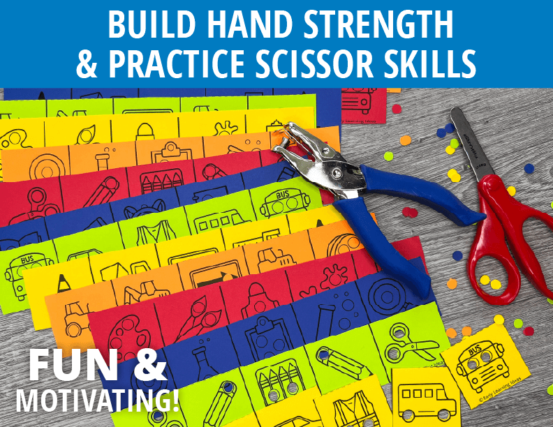 Help your kids build hand strength and develop scissor skills with these fun fine motor skills printable activities. Perfect for your preschool, pre-k, kindergarten, SPED, or OT classroom, your kids will LOVE using a hole punch and will get straight line cutting practice with these hole punch and cut strips.