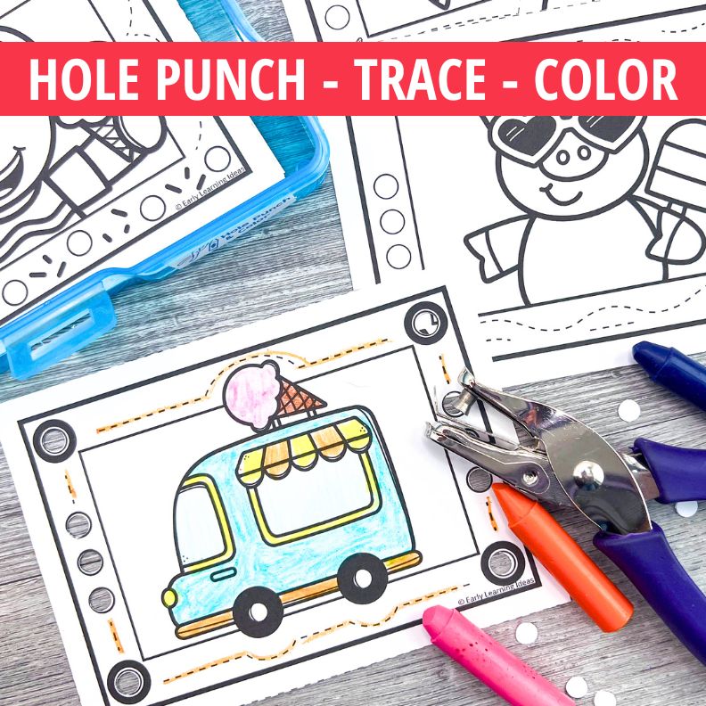 Boost your kids' hand strength and pencil control with this set of ice cream summer fine motor task cards. Perfect for an ice cream or popsicle day, these summer tracing and hole punch activities are easy-to-prep and provide a fun and motivating way for your kids to develop fine motor skills. Each unique ice cream-theme task cards gives kids an opportunity to hole punch, trace, and color. They are like mini coloring pages with with extra fun activities.