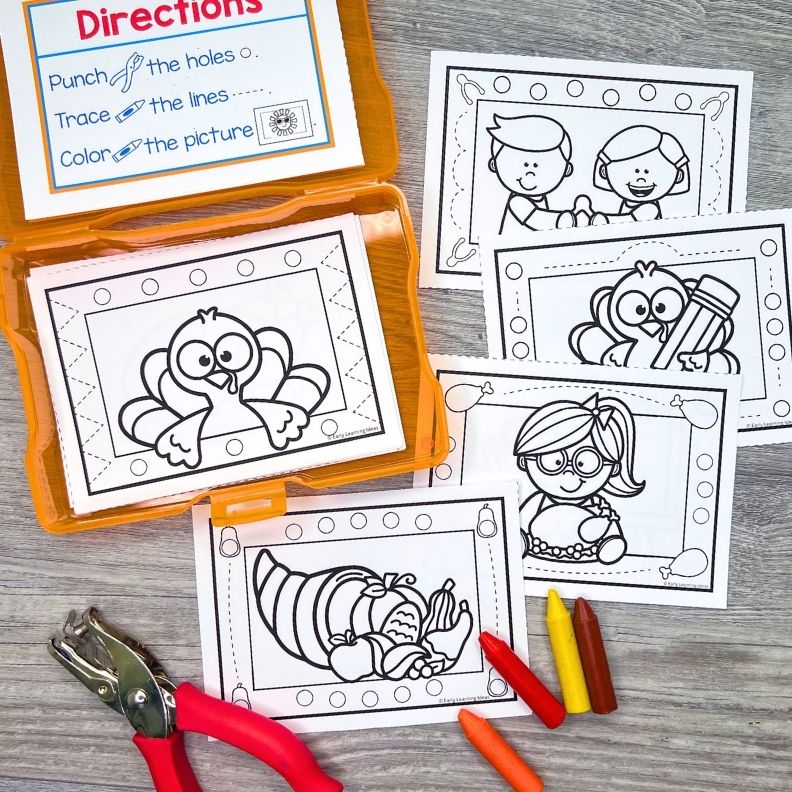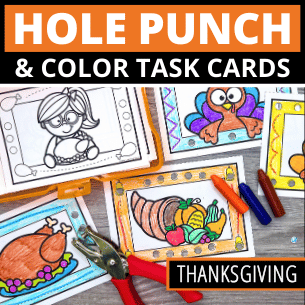 Perfect for your fall Thanksgiving theme, you can boost your kids' hand strength and pencil control with this set of Thanksgiving turkey fine motor hole punch activities task cards. The little Thanksgiving coloring pictures, hole punch, and line tracing practice activities task cards are perfect for November for your Thanksgiving or turkey theme units and lesson plans. The easy-to-prep fine motor activities provide a fun and motivating way for your kids to develop fine motor skills. Each unique Thanksgiving-theme task cards gives kids an opportunity to hole punch, trace, and color