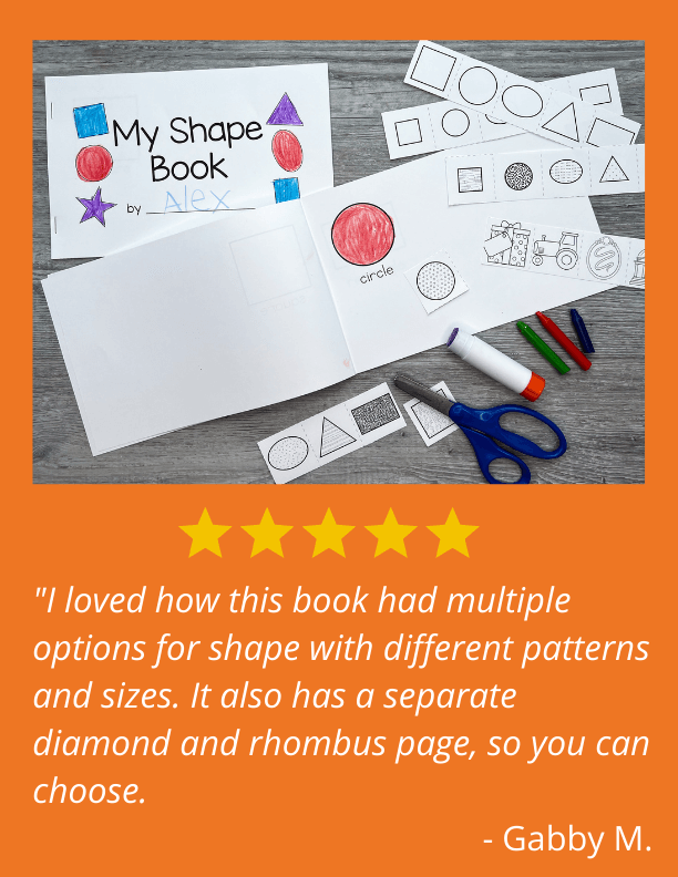 - 11 shape pages (square, circle, rectangle, triangle, oval, heart, star, pentagon, hexagon,diamond/rhombus)