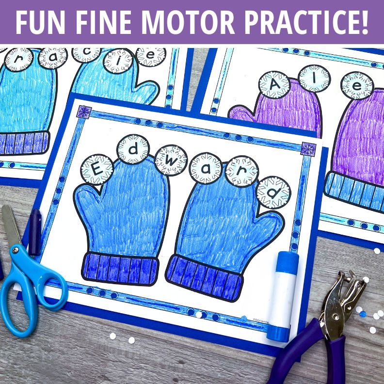 Use this fun winter mittens name practice craft activity for name recognition activities and cute winter bulletin boards. This winter cutting practice activity is perfect for your winter clothing study, winter units and winter holiday crafts. The best part is that the printable doubles as a fun winter fine motor activity. It provides opportunities for fine motor skills development through cutting practice, line tracing, and hole punching.