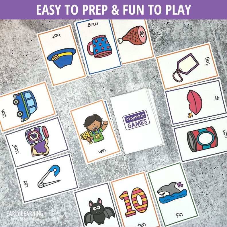 Are you looking for a fun and playful way to practice rhyming words and rhyming recognition? These easy-to-prep rhyming card games are a hands-on rhyming, CVC word family activity that will help your kids develop phonological awareness as they learn to recognize rhyming words while playing fun games. Each of the rhyming cards include a bright and clear picture featuring easy decodable CVC words. You can use the rhyming cards for fun card games, for rhyming assessment, or to practice segmenting onset and rime and blending onset and rime with simple CVC words.
