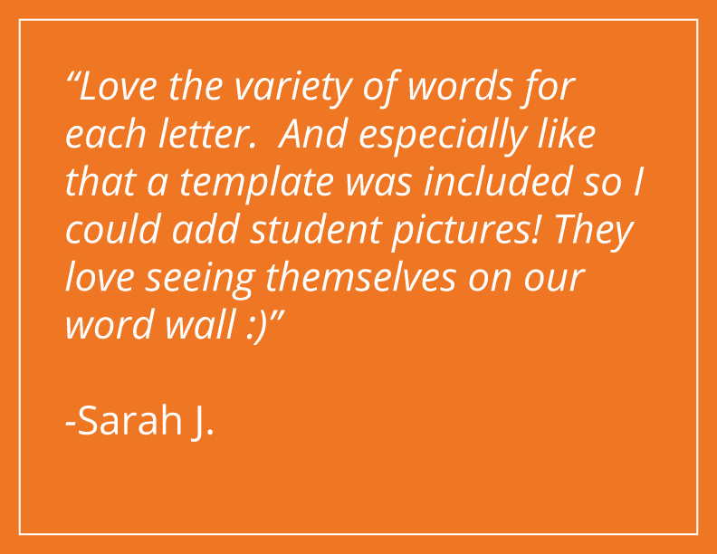 "Love the variety of words for each letter. And especially like that a template was included so I could add student pictures! They love seeing themselves on our word wall :)"